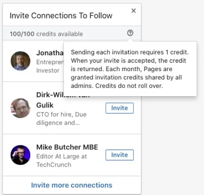 LinkedIn heeft ook een nieuw systeem toegevoegd voor het uitnodigen van nieuwe connecties. Bedrijven krijgen nu een limiet van 100 credits om mensen uit te nodigen met een volgverzoek. Wanneer iemand een uitnodiging accepteert, dan zal je pagina de credit weer terugkrijgen om opnieuw te gebruiken. Dit voorkomt dat bedrijven lukraak mensen gaan uitnodigen om hun pagina te volgen.