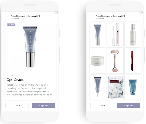 Met slimme shopping campagnes kunnen verkopers nu bepaalde kenmerken productadvertenties aangeven, zoals gratis en snelle bezorging. Op een later moment zal het ook mogelijk zijn om een carrousel advertentie met meerdere relevante producten te tonen. Daarnaast komt er ook de mogelijkheid om video content toe te voegen aan Display advertenties. Hieronder voorbeelden van hoe deze functies eruit komen te zien.